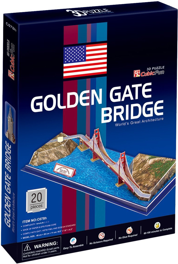 Мостът "Голдън Гейт", САЩ3D пъзелПъзел от 20 части Цена за доставка за гр. София - 2.90 лв. Безплатна доставка за София при поръчка над 50 лв. За цена и срок извън гр. София кликни тук. Този пъзел може да бъде доставен в дните: Вторник 22-10-2019 г., Сряда 23-10-2019 г. или Четвъртък 24-10-2019 г. Този пъзел може да бъде доставен в София и