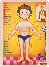С образователния пъзел на английски език от "Woodyland" малчуганите ще могат да научат какво се крие в човешкото тяло. Състои се от 13 двустранни елемента - от едната страна сглобени обрацуват картинка на момченце, а обърнати от другата разкриват вътрешните органи и мускули в човешкото тяло. Трябва да се подредят в изрязания силует на основата, а на самото място е нарисуван човешки скелет. Освен това на дъската има легенда да обозначените с цифри кости и органи, надписани с английските им имена. Така малчуганите могат да сверят по номерата кое какво е.