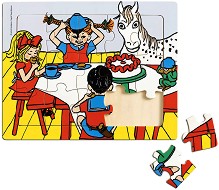 Пипи, Томи и АникаДетски дървен пъзел от 15 части от колекцията Пипи Дългото чорапчеПъзел от 15 части Доставка: