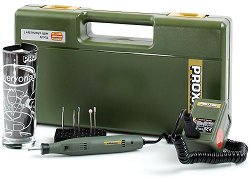 Мини машина за гравиране предназначена за гравиране върху стъкло, керамика или метал. Корпусът е изработен от полиамид, подсилен с фибростъкло. Накрайниците се поставят чрез напъхване с малки клещи или пинцети. Машината е в комплект с диамантен фрезер със сферична глава - ∅ 1.8 mm. Препоръчително е използването на трансформатор за напрежение Proxxon Micromot с номинал от поне 0.5 А - трансформатор NG 2/S или NG 2/E. Характеристики: захранване: 12 - 18 V, 25 W подходящи накрайници: ∅ 2.35 mm свободна скорост: 20000 minֿ¹ дължина: 145 mm тегло: 0.050 kg ... |