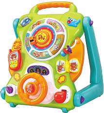 Проходилката за бутане тип уокър с активни занимания от "Hola" ще бъде добър приятел в прохождането на вашето дете. С нея то ще може да върви уверено, като се държи за удобната дръжка. Тя спомага за развиване на баланса, координацията и двигателните способности при първите му опити за прохождане. За моментите, когато бебето играе седнало, играчката е оборудвана с няколко занимателни игри и активности - подвижен волан с клаксон, скоростен лост, изваждащ се телефон с 3 бутона, малка книжка с картинки, бутони, мелодии, цветна сфера пълна с малки топчета и още много фигури и картини за опознаване. Количката за ... |