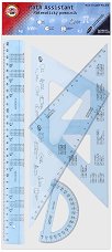 Комплект за чертане, изработен от прозрачна пластмаса с напечатани формули върху триъгълниците и линията. Подходящи са за чертане с изографи, химикалки и автоматични моливи. Характеристики: линия - 30 cm транспортир - 0 - 180° правоъгълен триъгълник с хипотенуза 22 cm равнобедрен триъгълник с хипотенуза 16 cm ... |