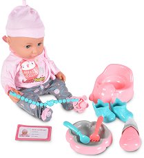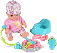 Всяко момиченце обича да играе на майка и бебе. Точно затова куклата бебе ще се хареса на госпожиците. Тя е подходяща за момичета над 3-годишна възраст. Куклата може и да пишка като истинско бебе, за по-реалистична игра. Тялото ѝ е изработено от пластмаса, а крайниците и могат да се движат, благодарение на което може да стои седнала. Бебето е облечено с панталонки, блуза и шапка в тон. Освен това, в комплекта ще откриете аксесоари като - гърне, шише, прибори за хранене, биберон и обувки. Когато вашето момиченце сложи своето бебе легнало, то затваря очите си като истинско. Куклата е с височина 36 cm. ... |