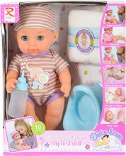Всяко момиченце обича да играе на майка и бебе. Точно затова куклата бебе ще се хареса на госпожиците. Тя е подходяща за момичета над 3-годишна възраст. Куклата може и да пишка като истинско бебе, за по-реалистична игра. Тялото ѝ е изработено от пластмаса, а крайниците ѝ могат да се движат, благодарение на което може да стои седнала. Бебето е облечено със гащеризонче, а на главата си има шапка. Освен това, в комплекта ще откриете аксесоари като - гърне, шише, памперс и прибори за хранене. Когато вашето момиченце сложи своето бебе легнало, то затваря очите си като истинско. Куклата е с височина 31 cm. ... |