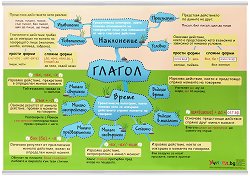 Учебното табло "Глагол" е ламинирано, с лайсни и въже за закачане. Таблото е с размери 70 x 100 cm. Таблото "Глагол" съдържа информация за: произход и значение; лице; число; вид; наклонение; залог; време. ...