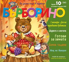 Списанието Бърборино на издателство Фют е предназначено за деца от 4 до 10-годишна възраст. То е незаменим помощник на педагозите в предучилищните заведения и 1. клас. Също така дава възможност за увлекателни съвместни занимания и пълноценно общуване на възрастните с децата в семейството. В списанието ще откриете: увлекателни четива; забавни развиващи игри и занимания; конкурси; модели за изрязване и сглобяване. Акценти в броя: 1 ноември - Ден на народните будители. Дървото и листата. Готови за зимата. Есенна гощавка. Нощ на Хелоуин. Хайде да направим: Кошнички за есенни листа. ... |