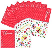 Комплектът се състои от 10 покани подходящи за рожден ден. На тях могат да се изпишат името на рожденика, за кого е поканата, датата, часът и мястото на събитието, както и телефонен номер за връзка. Всяка от поканите е с размери 11.5 x 7.5 cm. ... |