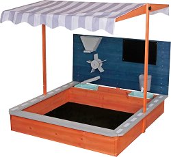 Детският дървен пясъчник от GINGER HOME е перфектното място за игра на открито за вашите деца. Той съчетава функционалност, безопасност и забавление, като е идеален за двора, градината или други външни пространства. Изработен от висококачествена ела, обработена за дълготрайност и сигурност, този пясъчник бързо ще се превърне в любимото място за игра на всяко дете. Пясъчникът разполага с регулируем покрив, който е UV и водоустойчив – предпазва децата от слънце и дъжд и осигурява комфорт по време на игра. На задната стена на пясъчника са разположени забавни и образователни елементи: пясъчна фуния, въртяща се мелница, ... |