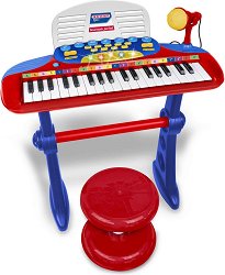 Вашето дете ще прояви своите дарби със синтезатора от Bontempi. Той е придружен от гласов микрофон и разполага с 24 клавиша, 16 мелодии и 7 мелодии с акомпанимент. Микрофонът има 16 демо песни, 4 ритъма на барабани, светлинни и звукови ефекти като овации и аплодисменти. Функциите на синтезатора са OKON обучение, запис и възпроизвеждане, контрол на звука и автоматично изключване. Децата ще изпълняват любимите си песни и ще се забавляват. Размерите на микрофона са 6 / 19.5 / 6 cm. Синтезаторът се захранва с 4 батерии AA, а микрофона с 3 батерии AA, които може да закупите отделно. ... |