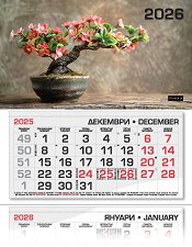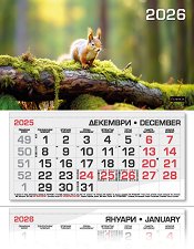 Характеристики на календара: 3 тела от 12 листа - на всеки лист по 1 месец (основен, предходен и предстоящ месец); фази на луната; имени дни; църковни празници; официални празници; съкращения на държавите, които честват свой празник на дадената дата; прозорче с ластици. ... |
