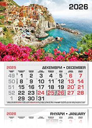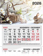 Характеристики на календара: 3 тела от 12 листа - на всеки лист по 1 месец (основен, предходен и предстоящ месец); фази на луната; имени дни; църковни празници; официални празници; съкращения на държавите, които честват свой празник на дадената дата; прозорче с ластици. ... |