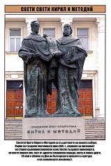 Таблото има 2 страни - на лицевата е разположена снимка на паметника на Светите братя Кирил и Методий, намиращ се пред Националната библиотека, а на гърба на таблото е предоставена синтезирана информация за живота им по години. Таблото е чудесно помагало за часовете по история. Светите братя Кирил и Методий са създателите на нашата азбука. Първо са създали глаголицата през 855 г., служела за писменост на стария църковнославянски език. После създават кирилицата, на която пишем ние, част от другите славянски народи, както и много други. 24 май е обявен за Ден на българската просвета и култура и на славянската писменост. ... |