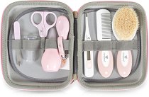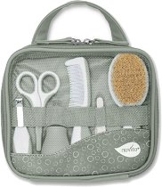 Комплектът от Nuvita съдържа всички важни тоалетни принадлежности необходими за вашето бебе, още от самото му раждане. Той се състои от четка за коса с естествен косъм, много нежна към първата бебешка коса, гребен със заоблени връхчета и ергономична форма, ножица със заоблен връх, нокторезачка с ергономична дръжка, назален аспиратор за почистване на ноздрите и 5 картонени пили за заглаждане на бебешките нокти. Всичко това се съхранява в практичен несесер с цип, който е идеален за пренасяне по време на пътуване. Несесерът е поставен в кутия, която го прави идеален за подарък. ... |