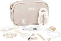 Бебешкият комплект с тоалетни принадлежности на Babymoov съдържа всички важни аксесоари, необходими за тоалета на вашето бебе, още от самото му раждане. Комплектът съдържа аспиратор за лесно и безболезнено почистване на нослето на бебето, малка ножичка със заоблени върхове, нокторезачка, пиличка и четка за коса с мек, изкуствен косъм, който нежно масажира скалпа на вашето съкровище. Разполагате също и със силиконов накрайник (напръстник) за масаж и почистване на венците и зъбките на бебето, гризалка с охлаждащ ефект, дигитален термометър с гъвкав връх и термометър за вана. Всичко това се съхранява в удобен несесер с цип, ... |