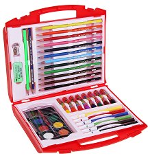 Ако държите на качеството и перфектната изработка - този комплект би ви доставил удоволствие с прецизната си балансираност - акварели с четка, вискококачествени маслени пастели, флумастери с "дишащи" капачки, цветни моливи, мек (2B) и твърд (НВ) графитни моливи, острилка и гума. С този комплект на вашия ученик ще са нужни само листове, за да е готов за часовете по изобразително изкуство. ... |