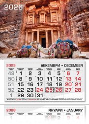 Характеристики на календара: 3 тела от 12 листа - на всеки лист по 1 месец (основен, предходен и предстоящ месец); фази на луната; имени дни; църковни празници; официални празници; съкращения на държавите, които честват свой празник на дадената дата; прозорче с ластици. ... |