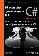 Трето издание. ... Обхваща C# 6.0. 50 конкретни начина за подобряване на вашия C#. В книгата "Ефективно програмиране със C#", трето издание, уважаваният експерт по.NET Бил Уогнър разглежда 50 начина за овладяване на пълната сила на езика C # 6.0 с цел създаването на изключително мощен, ефективен и добре работещ код. Отчитайки нарастващите възможности на езика C# и неговата общност от разработчици, Уогнър препоръчва десетки нови начини за писането на по-добър код. Новите решения, предлагани в това издание, включват такива, които се възползват от общите възможности, както и няколко, които са повече фокусирани ... |