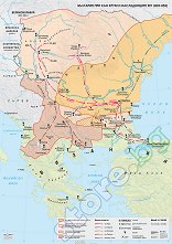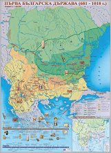 Характеристики: географска мрежа; хидрография; територията на България в края на VIII век и нейните разширения при хановете Крум, Омуртаг, Маламир и Пресиан, представени чрез фоново оцветяване и щриховка върху сенкорелеф; военни походи на кан Крум, хан Омуртаг, хан Маламир, хан Пресиан, Никофор I Геник и спечелени битки от българите, години; столици и градове; крепости; проходи; надписи на хидрография, държави, племена, историко-географски области и други; легенда. Картата е двустранно ламинирана. Изработена е от винил с пластмасови лайсни в долния и горния край и шнур на горната лайсна за окачване на картата. ... |
