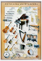 Учебното табло Музикални инструменти. Симфоничен оркестър е ламинирано, с лайсни и въже за закачане и е с размери 70 x 100 cm. На предната страна са представени следните музикални инструменти: пиколо флейта кларинет обой английски рог фагот контра фагот валдхорна корнет тромпет тромбон саксофон туба роял ксилофон тимпани чинели барабан голям барабан кастанети триангъл дайре акордеон дудук дудук-кавал кавал гайда тъпан контрабас вилончело виола цигулка класическа китара електрическа китара мандолина гъдулка тамбура На другата страна са представени разположенията на музикантите в ... |