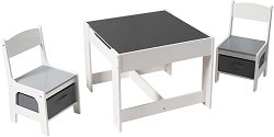 Комплектът на GINGER HOME се състои от 2 дървени столчета и масичка, които са чудесно допълнение към всяка детска стая. Масата има двустранен подвижен плот, а под нея е предвидено място за съхранение на материали за рисуване или дребни играчки. Едната страна на плота е с гладка повърхност, която детето може да ползва за игра, рисуване или хранене. Другата повърхност на плота представлява черна дъска, върху която може да се пише с тебешири. Столовете имат удобни облегалки, а под седалките им са разположени подвижни текстилни кутии за играчки. Размерите на мебелите са съобразени, така че да са удобни за използване от ... |