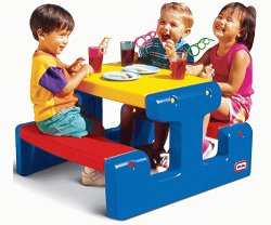 На пикник, в детската градината или на двора, тази масичка е перфектната мебел, която ще събере всички деца да играят заедно. Тя е достатъчно голяма, за да може вашето дете да си покани поне 5 приятели да седнат заедно. Разполага с лесен за поддържане плот и две удобни, ергономични пейки, здраво закрепени за масата. Малчуганите могат да си наредят моливи и флумастри за оцветяване върху широкият плот или да си похапват бисквитки и лакомства. Децата ще се чувстват самостоятелни и свободни да си играят на масичката, отделени в свой собствен кът. Детската маса е изработена от здрава и устойчива на атмосферните промени ... |