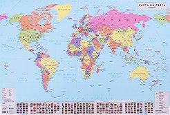 Картата съдържа информация за: географска мрежа; държави, представени чрез фоново оцветяване и държавни граници; знамена на държавите; столици; основни градове; хидрография; легенда. Стенната карта е с пластмасови лайсни по дългата страна. Размера на разпънатата карта е 140 x 100 cm. ... |