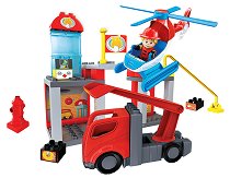 Комплектът съдържа 35 елемента за сглобяване на играчката: елементи за сглобяване на спасителен център фигура на пожарникар хеликоптер камион с кран противопожарен кран ...
