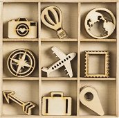 Комплектът за декориране от KPC включва 45 фигурки в дървена кутия с размери 10.5 x 10.5 cm. Фигурките са в 9 различни дизайна - фотоапарат, летящ балон, глобус, компас, самолет, рамка, стрела, куфар и символ местоположение. Те могат да бъдат използвани в изработването и оформлението на албуми и етикети, в опаковането на подаръци, в изработката на ръчно декорирани табели, плакети, картички, украшения и много други скрапбукинг проекти. Може да декорирате в комбинация с различни материали - акрилни бои, брокати, камъчета, панделки, хартия за декупаж и салфетки за декупаж. Какъвто и метод за декориране да ...