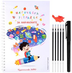Магическа тетрадка за най-малките е работна тетрадка за многократна употреба и е предназначена за деца от 3 до 6 години. Тетрадката съдържа 24 страници, 12 от които са с релефни елементи и фигури, по които детето пише с магическата химикалка. След няколко минути мастилото изчезва и упражненията могат да продължат. На останалите 12 страници има забавни игрови задачи, които целят да направят по-приятна работата с тетрадката. При работа с магическата тетрадка детето се научава да се концентрира, развива се абстрактното мислене, въображението и фината моторика. Комплектът съдържа: магическа тетрадка за най-малките; ... |