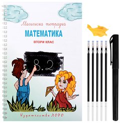 Магическа тетрадка Математика за 2. клас е работна тетрадка за многократна употреба, предназначена преди всичко за деца от 2. клас, тъй като съдържанието ѝ е съобразено със съответния учебен материал. Тетрадката съдържа 24 страници, на които са разположени релефни цифри и примери със сравняване на числа, събиране и изваждане, умножение и деление. Особено място е отредено на таблицата за умножение, която е много важен елемент в обучението във втори клас. Има и голямо разнообразие от геометрични, текстови и забавни задачи. С помощта на специалната магическа химикалка детето пише върху улейчетата. След няколко минути ... |