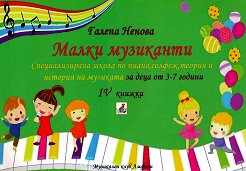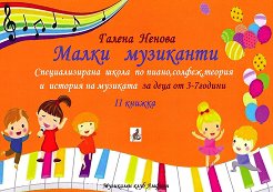 Специализирана школа по пиано, солфеж, теория и история на музиката за деца от 3 - 7 години. ... "Настоящата книжка е преломен момент в реализацията на тази система на обучение. Детето вече може да се ориентира в нотния текст и само, но все още е нужна помощта на родителя, що се отнася до разчитането на задачите и кратките вече упътвания в случай, че детето още не знае да чете или в насочването на конкретизирането на мисълта му. В книгата е застъпен мащабен обем знания, изграждащ основата на самостоятелността при музикалните занимания. Но скоро вече ще е нужен контрол, що се отнася до правилната постановка на ръката ... |