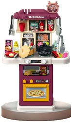 Кухнята ще е прекрасен подарък за всеки малък готвач, който обича да помага в готвенето. Тя се състои от 2 котлона, фурна, мивка, светещо меню, таймер, рафтове, микровълнова фурна, хладилник, прибори, тенджера, тиган и шкафче. Към нея са добавени и хранителни продукти, които представляват зеленчуци, филия хляб, кроасан, бонбони, бургер, багета, яйце, плодове, прясно мляко, йогурт и други. Когато напълните котлоните с вода, поставете тенджера или тиган върху тях, след което завъртете копчето настрани и от тях ще почне да излиза пара. Мивката има кран, от който може да тече вода, която се пуска чрез натискане на бутонче. ...