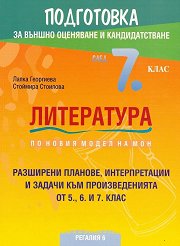 По новия модел на МОН. ... Книгата е свързана с литературната подготовка на учениците от прогимназиалния етап на обучение, които ще полагат изпит за национално външно оценяване след завършен 7. клас. Тя отразява най-новите промени, въведени от МОН, въз основа на които е изготвен изпитният формат по български език и литература. Съдържанието включва: разгърнати учебни планове за изучаваните 22 творби на базата на авторски интерпретации на проблемите; задачи със структуриран отговор с възможности за избор; задачи с кратък свободен отговор за съставяне на текст разсъждение от 3 - 4 изречения върху цитат от ...