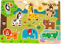Дървеният пъзел с дръжки от Hi Pando кани малките изследователи на първа среща с дивия свят по лесен, визуален и много увлекателен начин. Включва ярки и реалистични изображения на различни диви животни, които привличат вниманието и събуждат любопитството към природата. Всяко парче има удобна дървена дръжка, създадена за лесно захващане и поставяне на правилното място, което превръща подреждането в истинско удоволствие за малките ръчички. Помага за развитие на фината моторика, координацията око–ръка, концентрацията, логическото мислене и разпознаването на животински форми. Изработен от естествено дърво с безопасни, ... |