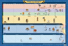 Стенната карта съдържа линия на времето за периода 2.5 млн. г. пр. Хр. - 476 г. сл. Хр. В различни цветове са нанесени дяловете Праистория, Първите цивилизации, Древна Елада и елинистическият свят, Древна Тракия, Древен Рим. С подходящи изображения са показани значими древни паметници и важни събития, разположени на линията според тяхната датировка. Картата е ламинирана и устойчива за многократно използване, с качествена полиграфия и метални лайсни, като на горната лайсна има две дупки за окачване на стена. Тя е с размери 100 x 70 cm. Автор на картата е проф. дин Диляна Ботева-Боянова. ... |