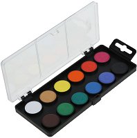 Акварелни боички в палитра от 12 цвята в светли и тъмни нюанси, събрани в пластмасова кутия с правоъгълна форма и четка. Боичките се предлагат в по-малък и в по-голям вариант. По-малката палитра е с дължина 17.2 cm, а всеки един от цветовете в нея е с диаметър 2.5 cm. По-голямата палитра е с дължина 20.9 cm, a всеки един от цветовете в нея е с диаметър 3 cm. ...