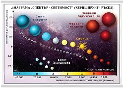 Херцшпрунг - Ръсел. ... Тази диаграма се нарича още "Диаграма на Херцшпрунг-Ръсел" по имената на астрофизиците, които първи са я построили. По абсцисата са нанесени спектралните класове (или температурата на повърхността на звездите), а по ординатата - светимостта. Цветовете на изобразените звезди показват към кой спектрален клас принадлежат. Изследванията показват, че звездите се групират в т. нар. Последователности. Преобладаващата част от звездите образуват Главна последователност. Ясно се вижда мястото на Слънцето в Главната последователност. Под Главната последователност се намират звезди известни като бели ... |