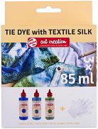 Tie-dye е техника за оцветяване на текстил, която обикновено включва сгъване, увиване или намачкване на плата и завързването му с канап или ластици, след което се нанасят боите. Така боята не може да достигне до местата на връзване и при разгъването на тъканта се получават красиви шарки. Комплектът Tie Dye Blue от серията Art Creation на Royal Talens включва 3 шишенца с течна боя за коприна и чифт ръкавици. С него може лесно да оцветите любимата си тениска, кецове, шалове, чанти, възглавници, завеси и други. Боите се предлагат в тубичка с остър накрайник, позволяващ контролиране на използваното количество боя. ...