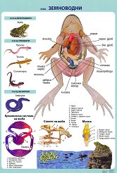 Таблото "Земноводни" е ламинирано и съдържа информация за: разред безопашати; разред опашати; разред безкраки; кръвоносна система на жаба; скелет на жаба; мозък. ...