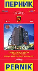 Включва регионална карта. Проверена с GPS. ... Информация за историята и природата на населените места (на български и английски). Справочна културна, туристическа и бизнес информация за Перник (на български и английски). Туристически гид на регионите (на български и английски). Важни телефонни номера за Перник (на български и английски). Индекс на улиците за Перник и Радомир. Променени имена на улици за Перник и Радомир. Улици със звезди за Перник. Мащабите за другите градове са: Радомир - M 1:15 000 Трън - M 1:11 500 Брезник и Земен - M 1:11 000 Ковачевци - M 1:13 000 Регионална карта - M 1:300 000 Размери на ... |