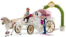 Всички са поканени на дългоочакваната сватба на Лейксайд. Да, дори и ти! Приятелките на булката Емили и нейният възлюбен Тоби, са се погрижили да украсят сватбената карета с цветя и тенекиени кутии. Хана пък се е заела със задачата да играе ролята на кочияш и е впрегнала най-красивия си липциански жребец, който гордо тегли сватбената карета. За добре свършената работа го очакват вкусни зелени ябълки, скрити под седалката на каретата. Фигурките от Schleich ще ви впечатлят с прецизна и детайлна изработка. Те са направени от пластмасов полимер и са подходящи както за украса, така и за активна игра. Комплектът включва 3 ... |